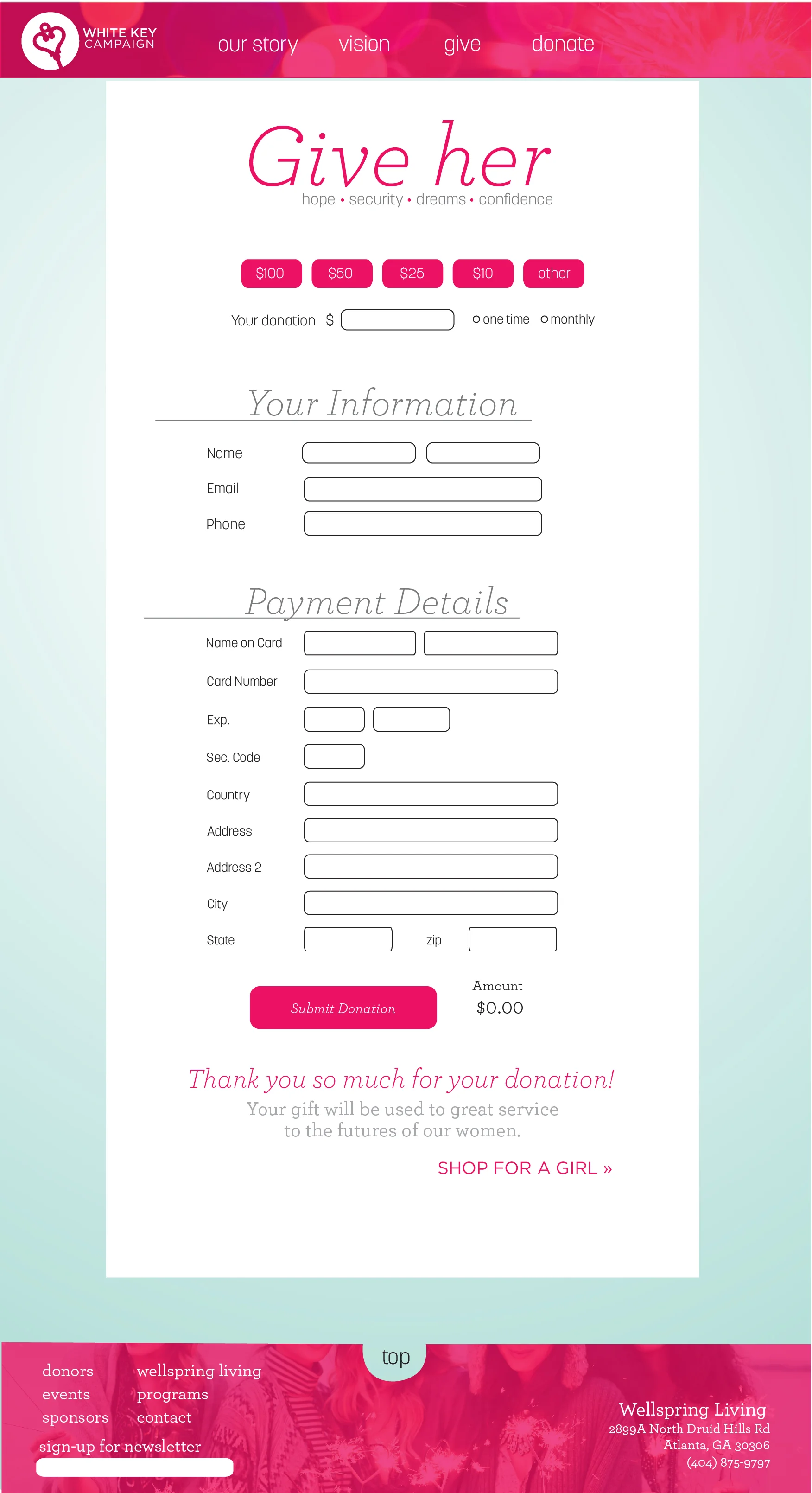 The White Key Campaign was created for Wellspring Living, a nonprofit organization that works with women and teens coming out of sex trafficking. White Key raises money for rent and outfitting apartments that the women can transition into while they're going through therapy and job training. Elements designed include a logo, brochure, prayer card, interactive website where donors can purchase specific items for apartments, and a symbolic 'white key' for survivors to receive when they move in.